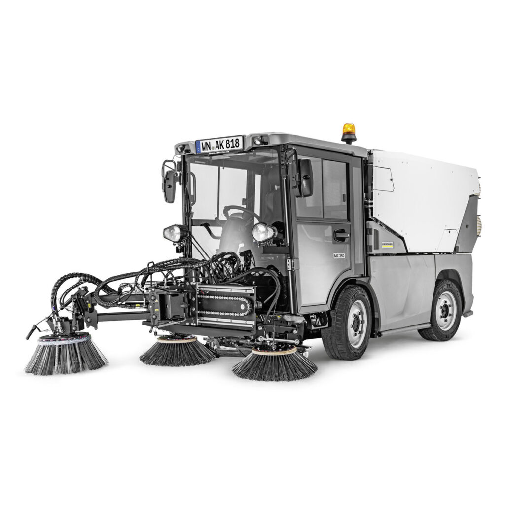 Die Kommunaltechnik genießt hohe Priorität bei Kärcher. Deshalb haben wir unser ganzes Know-how und unsere reichhaltige Erfahrung in die Entwicklung der Saugkehrmaschine MC 250 investiert. Im Ergebnis bietet die attraktiv designte MC 250 eine unübertroffene Reinigungsleistung bei geringer Motordrehzahl, üppige 2,5 m³ Kehrgutbehältervolumen, eine hohe Transportgeschwindkeit von 60 km/h und einen dank hydropneumatischer Federung und Einzelradaufhängung maximalen Fahrkomfort. Die optional auch klimatisierte Großraumkabine mit rückenschonenden Sitzen und das ergonomische Bedienkonzept mit übersichtlichem Multifunktionsdisplay im Lenkradkranz sorgen für ein angenehmes Arbeitsklima und hohe Anwenderfreundlichkeit. Unsere MC 250 verfügt darüber hinaus über eine Allradlenkung für beste Wendigkeit und ein effizientes Wasserumlaufsystem mit separatem Schmutzwassertank. Die Maschine eignet sich für Städte und Gemeinden jeder Größe, ist sehr einfach zu warten und überzeugt dazu mit sehr geringen Abgas- und Feinstaubemissionen.