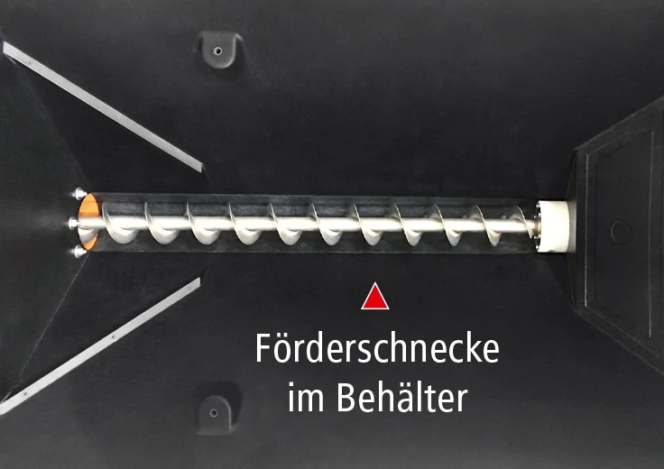 Die Förderschnecke befördert das Streugut aus dem Behälter zur Streueinrichtung. Ist der Nachfluss blockiert, schaltet sich automatisch der serienmäßige Rüttler zu und lockert bei Bedarf das Streugut im Behälter, damit es wieder nachfließen kann.