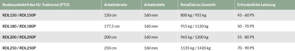 | Bodenumkehrfräse für Traktoren (PTO) | Arbeitsbreite | Arbeitstiefe | RotaDairon Gewicht | Erforderliche Leistung |