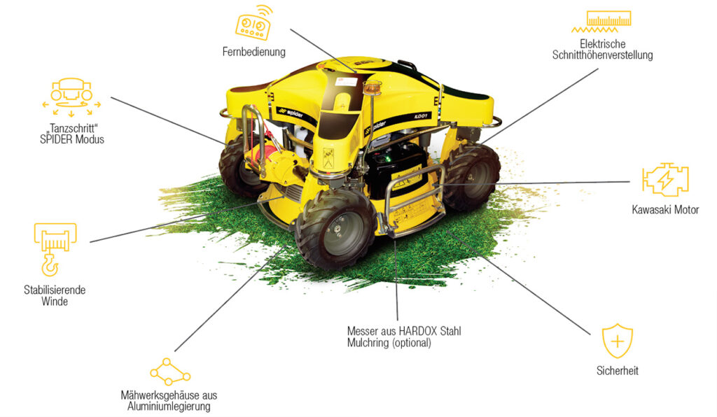 Der SPIDER ILD01 hat seit seiner Markteinführung internationale Anerkennung und zahlreiche Auszeichnungen auf Messen und Ausstellungen erhalten. Als erste ferngesteuerte Maschine für die professionelle Pflege von Steillagen überzeugt der ILD01 durch herausragende Steigfähigkeit und einzigartige Manövriereigenschaften, die auf dem revolutionären und patentierten Antriebssystem, dem sogenannten „Tanzschritt“, basieren.
